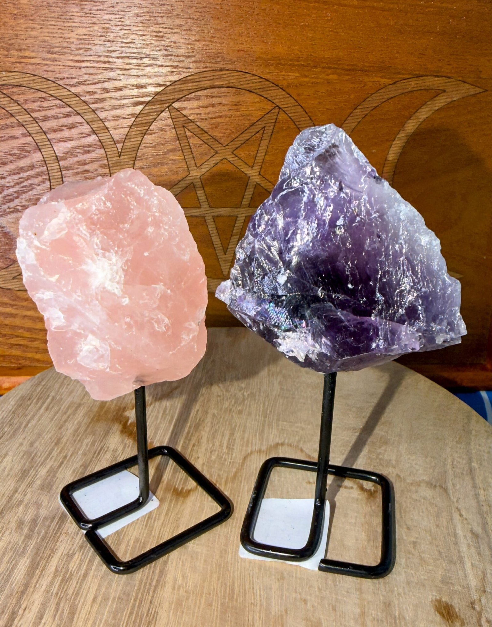 Raw Rose Quartz + Raw Amethyst on Metal Stand