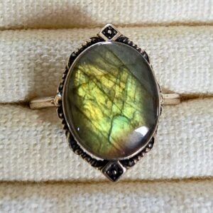 Mysterious and mesmerizing, the Labradorite Ring shimmers with flashes of blue, green, and gold — a natural display of light known as labradorescence. Often called the Stone of Transformation, Labradorite embodies protection, intuition, and spiritual awakening.